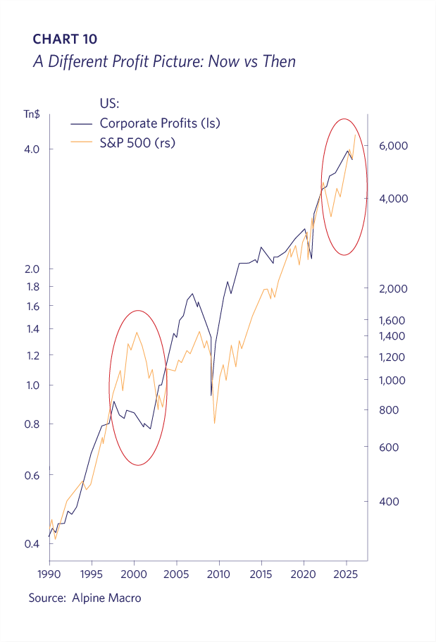 Investor sentiment today contrasts strongly with the 1990’s experience. Meta shares recently sold off due to an increase in its capital expenditure guidance. Oracle’s shares have similarly retrenched due to concerns about its ability to fund its large AI ambitions. This contrasts starkly to the late 90’s, when adding “dot-com” to a company’s name led to massive stock gains.