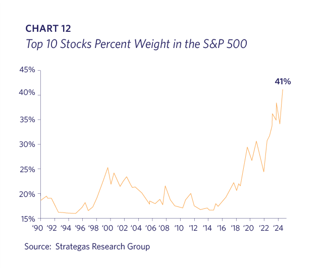 The upcoming year might see stronger stock market performance from companies that have struggled under the Federal Reserve’s restrictive interest rate policy. A combination of lower interest rates, lighter regulation, and resolved tariff and tax policies may help these sectors. Tech leadership in the market-cap weighted indices has masked mediocre performance from many other public company stocks. If this occurs, it wouldn’t portend a shift away from the “AI trade,” but rather a healthy market broadening.