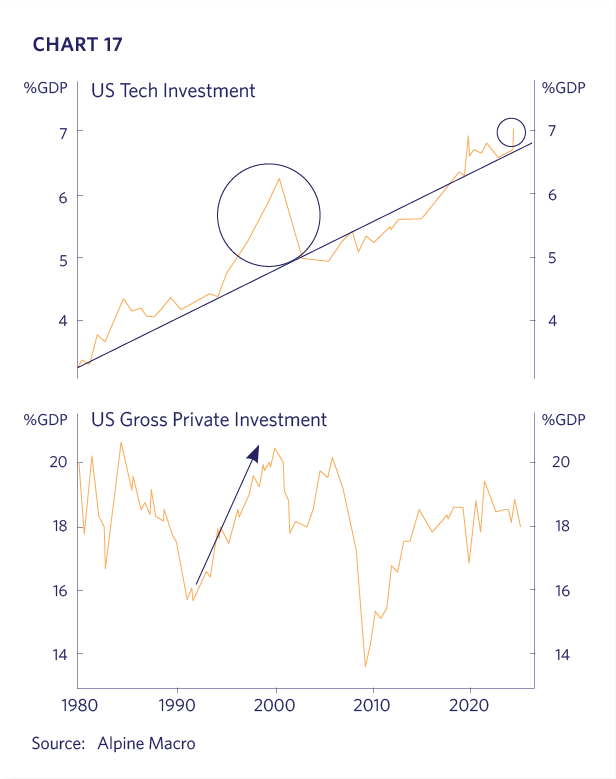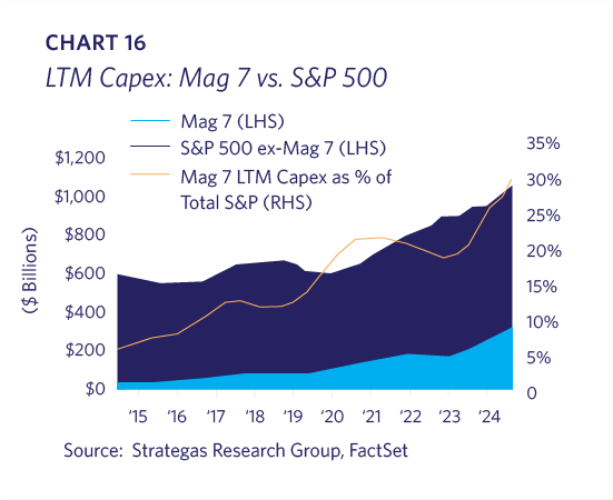 Due to the AI build-out, electricity consumption by data centers is projected to more than double from 2022 to 2026 (Chart 14). Data center construction spending has skyrocketed since the public launch of OpenAI’s ChatGPT (Chart 15). The Mag 7 (i.e. Table 1 less Broadcom) are expected to plow over $400 billion this year into AI infrastructure, and their spending now represents over 30% of the S&P 500’s capital investment (Chart 16). These record-breaking capital expenditures (“capex”) should be viewed in the context of a structural rise in Technology’s share of total investment, which has been underway for decades. Thus far, the increase above trend is moderate, particularly relative to the 1990s (Chart 17).