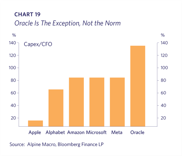Meanwhile, most AI capex is being funded out of corporate cash flows by the Big Tech leaders with Oracle and its more debt-fueled ambitions as the exception (Charts 18 and 19).