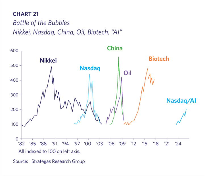 The severity of any eventual downdraft will be proportional to the degree of excess on the way up. While it may feel like the AI bull market has already been extreme, it is actually fairly tame compared to previous market bubbles (Chart 21).