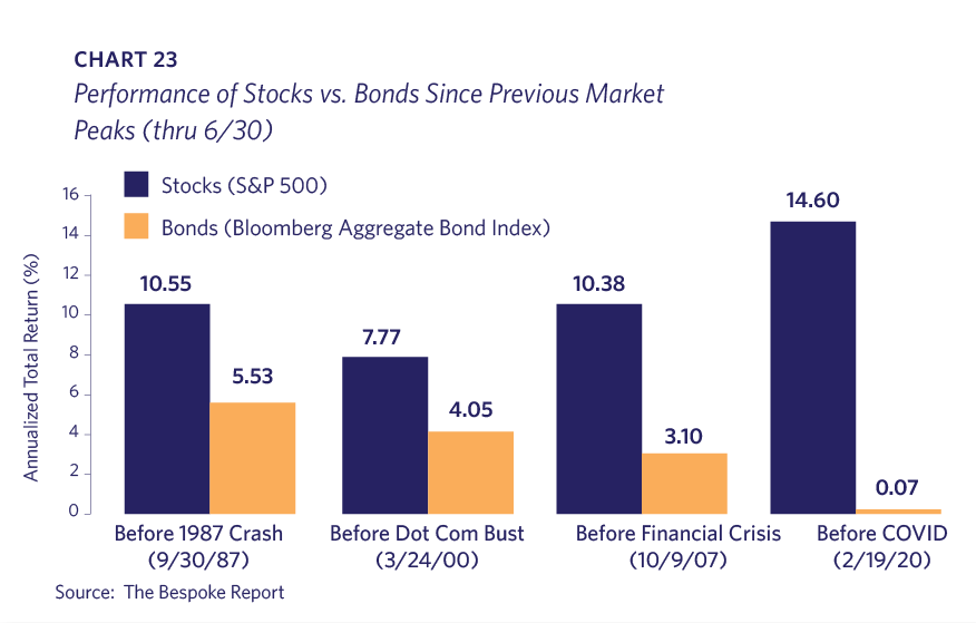 There should be solace in that time has historically resolved favorably for the stock investor who perseveres. Even for investors who entered the market right before the four largest market crashes over the past 40 years, U.S. stocks have subsequently returned a minimum annualized return of 7.77%. In each scenario, stocks outperformed bonds (Chart 23).