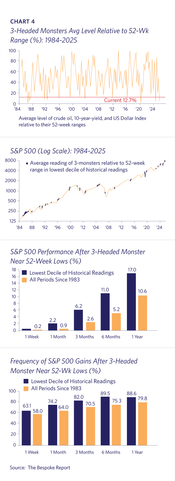 U.S. interest rates, oil prices, and the U.S. dollar index levels relative to their respective 52-week high-low ranges are in the lowest decile of all historical readings. When this “Three Headed Monster” hits these levels, forward returns are typically substantially above historical averages, and more frequently positive (Chart 4).