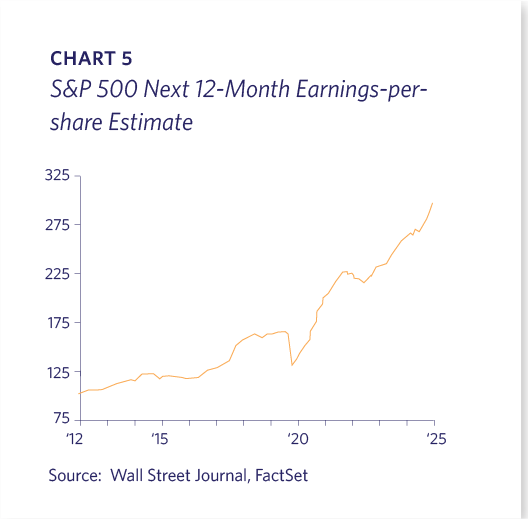 Although investors are aware that U.S. stock indices are hitting all-time highs, it is easy to miss how much Earnings Per Share (“EPS”) have increased over time. The S&P 500’s next 12 months EPS is forecast to be over $300, versus slightly over $100 in 2012 (Chart 5). The market has been strong, but so have profits.