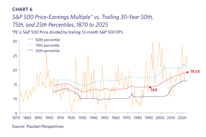 Still, it is true that U.S. stock valuations have increased noticeably over time, particularly since 1990. Price/Earnings’ multiple expansion for the S&P 500 has occurred across the entire market and has not just been pulled up by the top performers in the index (Chart 6).